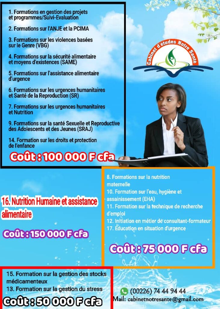 Le cabinet d’études notre santé est un centre spécialisé dans les formations d’envergure internationale, les évaluations externes, le consulting, la vente de la farine infantile et du matériel médicotechnique