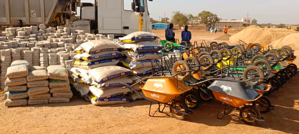 10 brouettes et 10 pelles, pour faciliter le transport et les travaux manuels sur le terrain.