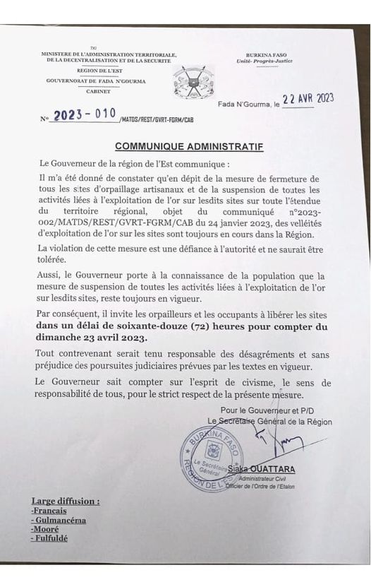 Il rappelle que cette mesure est toujours en vigueur et invite les orpailleurs et occupants à libérer les sites dans un délai de 72 heures à compter du dimanche 23 avril 2023. Tout contrevenant sera tenu responsable des désagréments causés et fera l’objet de poursuites judiciaires.